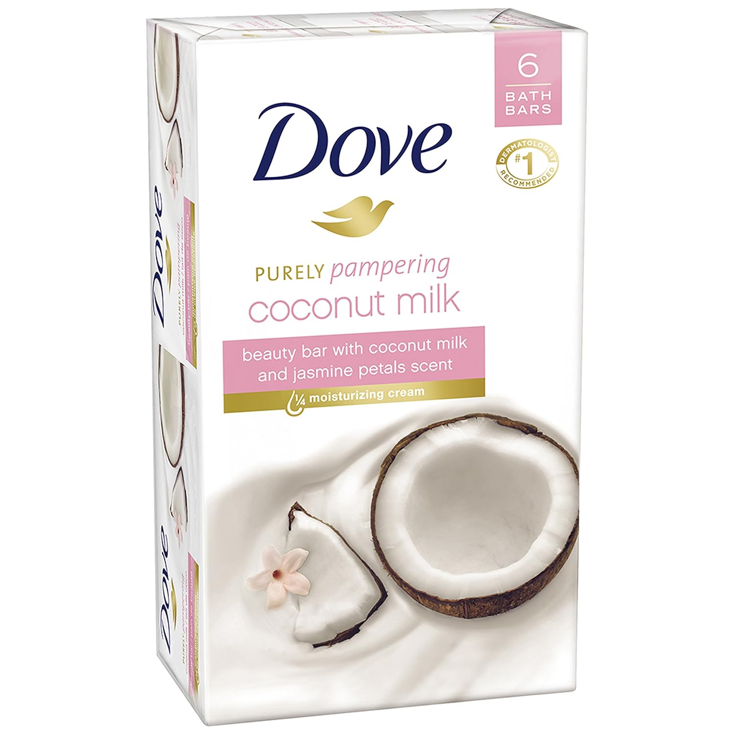 - Dove Beauty Bar Purely Pampering Coconut Milk with coconut milk and the comforting scent of jasmine petals
