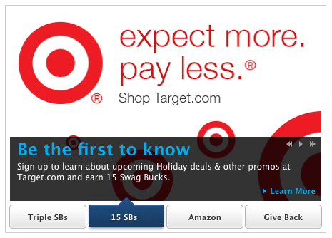On the Swagbucks homepage right now, is an offer to register for the Target newsletter and it’s worth 15 SB.